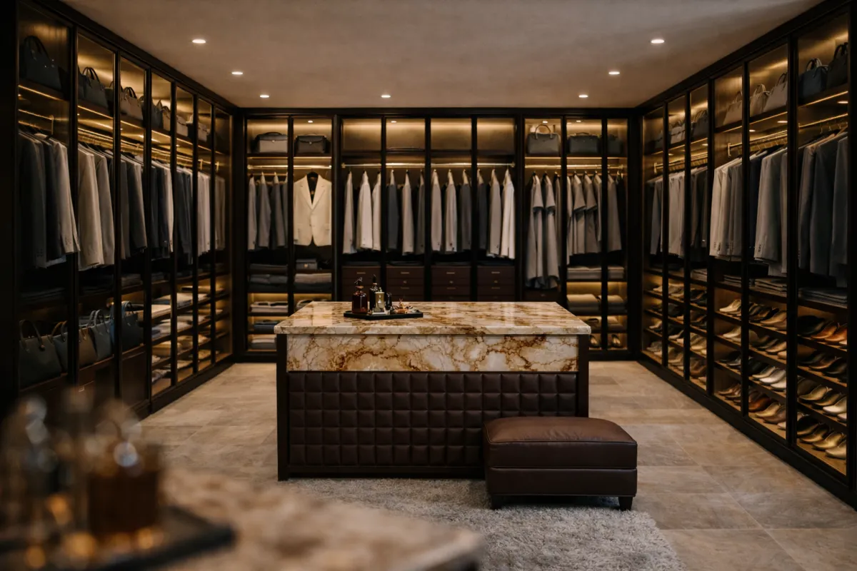 At the center, a sculptural island with marble or quartz top supports folding, styling, and composition, finished with leather inlays for tactile contrast. Full-height mirrors, softly backlit or gilded, expand light and scale, while integrated LED rods and drawer lighting erase shadows with museum-grade clarity.