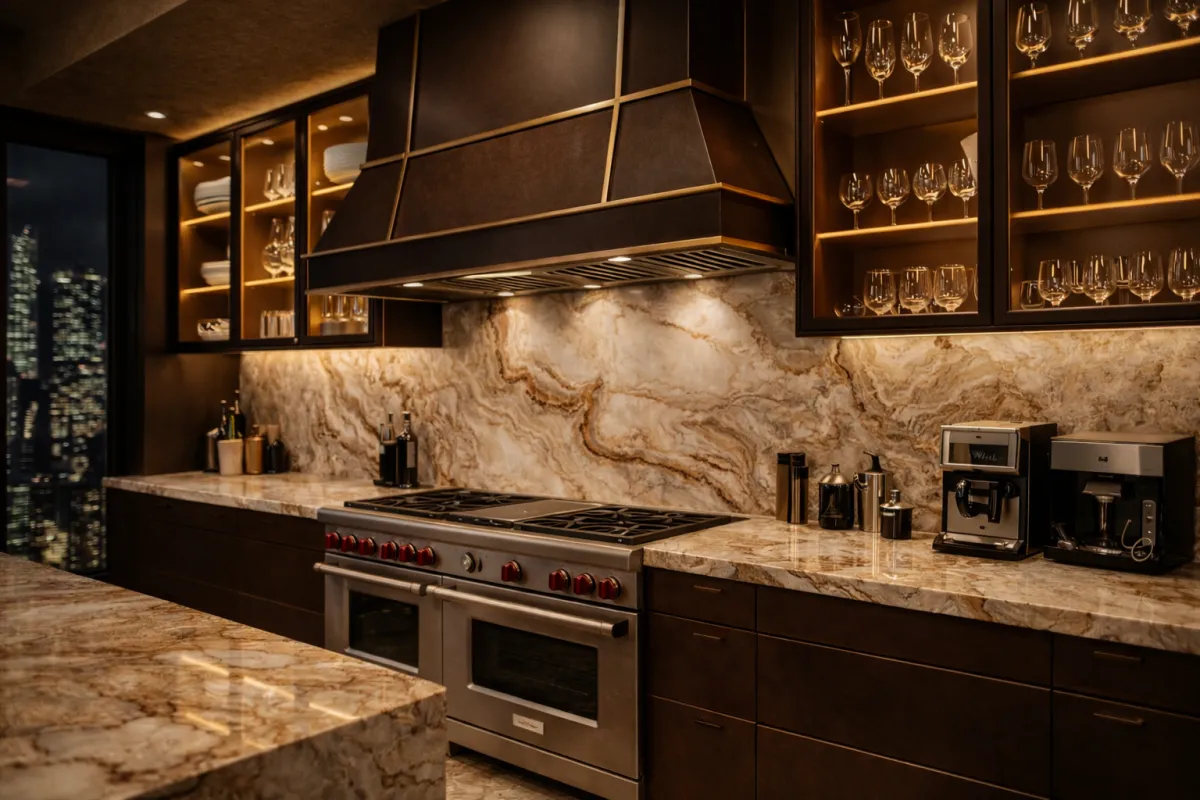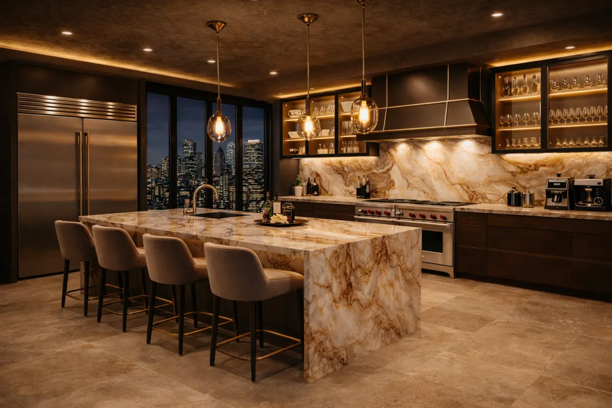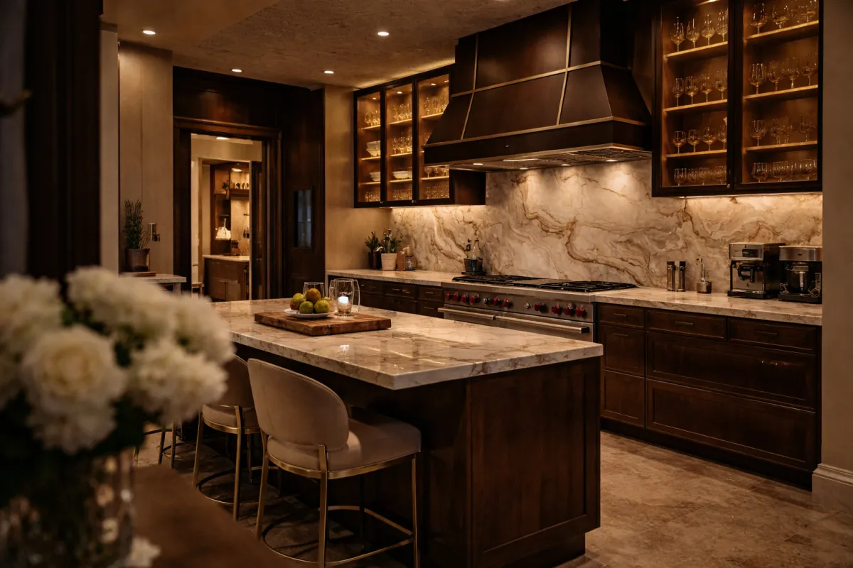 Calacatta marble countertops anchor expansive islands designed for preparation, dining, and gathering. Dedicated zones - coffee stations, wet bars, and butler’s pantries - allow the kitchen to perform effortlessly at multiple scales, supporting both daily ritual and entertaining.