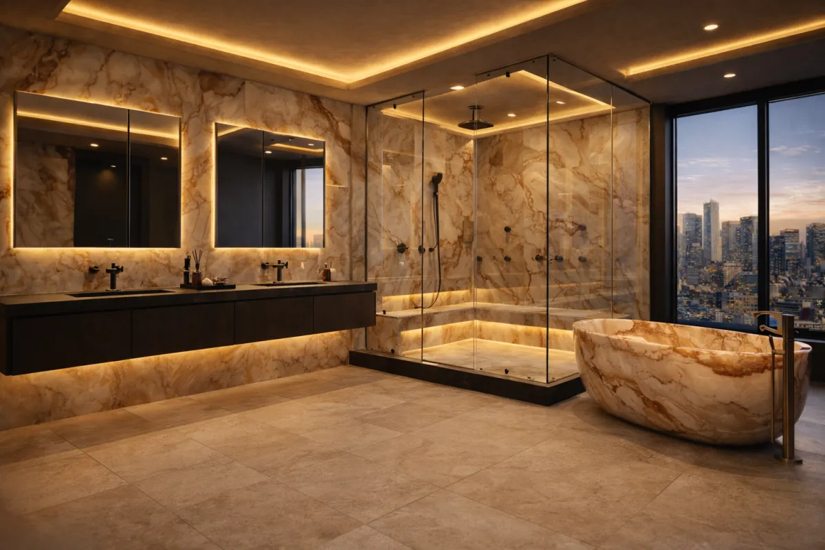 Materials are selected for permanence and sensory richness. Calacatta or Carrara marble is used extensively, complemented by natural stone and refined brass or copper fixtures that patina beautifully over time. Every surface is chosen not only for beauty, but for how it holds warmth, reflects light, and supports daily ritual.